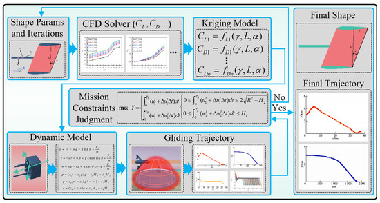 Releasing interference decoys is an important means of aircraft penetration, and interference decoys can perform reconnaissance, jamming, and other tasks during aircraft penetration. Research on interference decoys has attracted attention from various countries [1,2,3]. The flight trajectory of the decoy in the air after release is related to whether it can effectively interfere with enemy air defense firepower, but the flight trajectory and aerodynamic shape have a strong coupling relationship. Therefore, the integrated optimization of the aerodynamic shape and glide trajectory of the decoy is one of the design difficulties. A large number of studies have been conducted in academia on the coupled aerodynamic and trajectory optimization of aircraft. However, relatively few studies have been conducted on the dynamic modeling and trajectory optimization of decoys; from this research, some design optimization methods for decoys, being unpowered gliding vehicles, can be drawn.