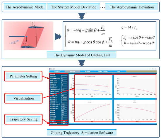 As shown in Figure 5, the trajectory simulation software is a flight trajectory simulation software developed based on the gliding tail model. It is an important computational tool for comprehensive optimization of a gliding tail. This software integrates the aerodynamic model, dynamic model, system model deviation, aerodynamic deviation, meteorological deviation, and other elements of the gliding tail, including parameter settings, aerodynamic data loading, trajectory data visualization, trajectory data saving, and other modules. Based on the initial deployment conditions and aerodynamic data set by the gliding tail, the gliding trajectory of the tail in the air can be simulated and generated.