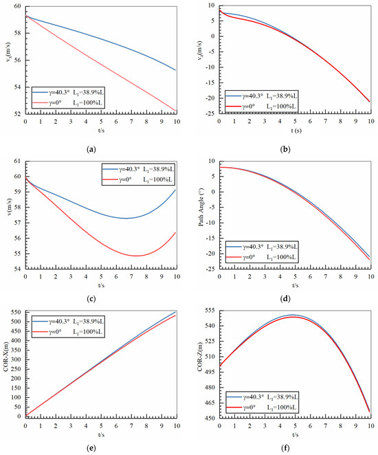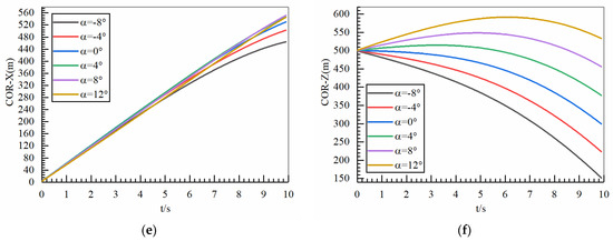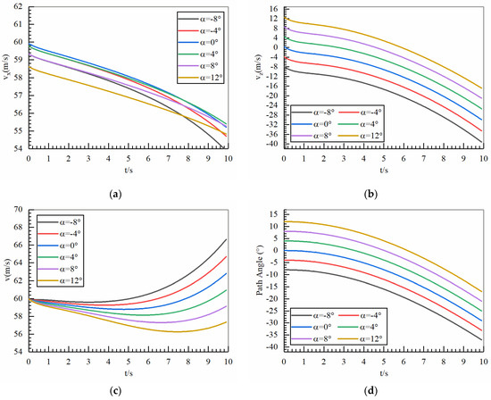 Firstly, the initial velocity of the tail after being deployed is 60 m/s, and the initial height is 500 m. The impact of the deployment posture angle on the trajectory of the tail is analyzed, where the posture angle represents the angle between the chord line in the tail and the horizontal plane. As shown in Figure 6a, when the delivery time t = 0 s, as the delivery posture angle gradually increases, the velocity of the ducted tail wing in the X-axis direction gradually decreases. When the deployment time t = 10 s, after the UAV body flies through the defense, the maximum speed of the tail wing in the X-axis direction is achieved when the initial deployment posture angle of the tail wing is 4°. When the initial deployment posture angle of the tail wing is −8°, the speed of the tail wing in the X-axis direction is the smallest. Moreover, the velocity of the tail decoy in the X-axis direction is generally greater than the other deployment posture angles at time t = 0 s~10 s and with an initial deployment posture angle of 4°. As shown in Figure 6b, when the deployment time t = 0 s, as the deployment posture angle gradually increases, the velocity of the ducted tail wing in the Z-axis direction gradually increases. However, due to the influence of gravity, the velocity of the tail wing in the Z-axis direction decreases with an increase in gliding time. When the simulation time t = 10 s, after the UAV body flies through the defense, and when the initial deployment posture angle of the tail wing is 12°, the speed of the tail wing in the Z-axis direction is the highest, indicating that a 12° deployment posture angle is more conducive to the tail wing obtaining a higher gliding height. As shown in Figure 6c, by further analyzing the gliding speed of the tail, it is found that the gliding speed of the tail decreases as the deployment posture angle increases. By analyzing Figure 6d, as the posture angle of the tail fin increases, the posture angle decreases with the same gradient during tail glide. It is found that under different initial deployment posture angle conditions, the change in the posture angle of the tail wing during gliding shows a consistent trend. By analyzing Figure 6e, it is found that when the initial deployment angle is 4°, the tail has the maximum gliding range within 10 s, reaching 547.3 m. However, by analyzing Figure 6f, it is found that when the initial deployment angle is 12°, the maximum gliding height of the tail at 10 s is more favorable for the tail to glide in the air.
