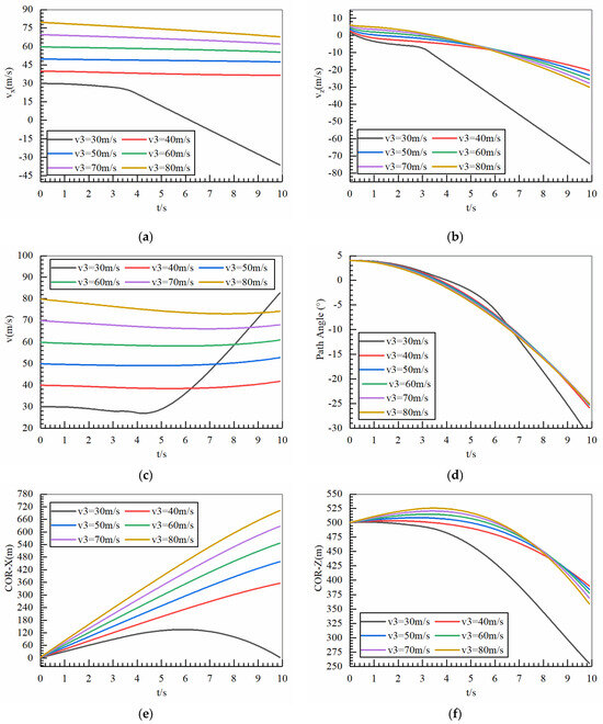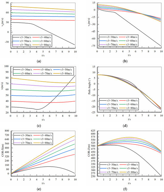 Firstly, the tail fin is deployed at a height of 500 m with a deployment posture angle of 4°, and the impact of deployment speed on the tail fin trajectory is analyzed. As shown in Figure 7a, as the deployment speed gradually decreases from 80 m/s to 30 m/s, the velocity of the tail decoy in the X-axis direction gradually decreases. Especially when the deployment speed is 30 m/s, after 3 s of deployment, the speed in the X-axis direction of the tail decoy rapidly decreases, and even a negative X-axis speed phenomenon occurs, indicating that the tail fin has a U-turn phenomenon in the air, which is not conducive to its gliding in the air. As shown in Figure 7b, when the deployment time t = 0 s, with a gradual increase in deployment speed, the velocity of the tail decoy in the Z-axis direction gradually increases. However, due to the influence of gravity and aerodynamic forces at different angles of attack, the velocity of the tail decoy in the Z-axis direction decreases with an increase in gliding time. When the simulation time t = 10 s, after the UAV body flies through the defense, the maximum speed of the tail wing in the Z-axis direction is achieved when the initial deployment speed of the tail wing is 40 m/s. As shown in Figure 7c, through further analysis of the gliding speed of the tail wing, it is found that as the speed increases, and due to the unpowered gliding of the tail wing, its gliding speed gradually decreases. However, when the deployment speed is 30 m/s, the aerodynamic force generated is not sufficient to overcome gravity and glide in the air. Gravity is the main factor, so the gliding speed of the tail wing increases instead. By analyzing Figure 7d, it can be found that the trend of the posture angle change during tail gliding is consistent with the increase in tail deployment speed. However, an exception is made when the deployment speed v = 30 m/s. Compared with other deployment speeds, the posture angle of the tail is more variable in the gliding process, because the tail glides at a smaller speed and does not generate enough lift to overcome its own gravity. By analyzing Figure 7e, it is found that when the initial deployment speed is 80 m/s, the tail fin has the maximum gliding range within 10 s, reaching up to 703 m. By analyzing Figure 7f, it is found that when the initial deployment speed is 40 m/s, the maximum gliding height of the tail fin occurs at 10 s, which is more conducive to the tail fin gliding in the air.