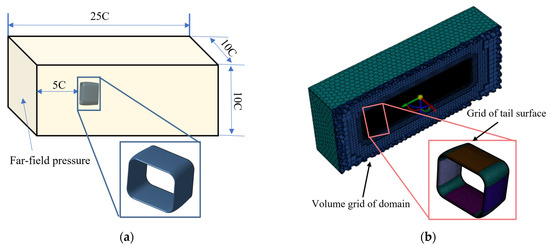 When solving for the aerodynamic parameters using Ansys Fluent 2021 R1, in order to verify whether the meshing and numerical simulation methods were independent of each other, the tail before optimization was selected as the verification object. Reference [25] points out that in any CFD study, selecting the appropriate domain size and shape is important, and the domain should be large enough to induce turbulence dissipation and wake and wing tip vortex formation effects, causing reverse/backflow. As shown in Figure 10a, the computational domain is a rectangular body. The boundary conditions of the computational area are far-field pressure, and the walls are bounded by a no-slip mesh. By using the chord length C = 0.2 m, the height, lateral length, and width of the computational domain are 10 C, 25 C, and 10 C, respectively. Figure 10b shows the mesh model, which adopts the Poly-Hexcore unstructured hybrid mesh, and the thickness of the first layer of the wall is 3 × 10−6 m. Taking into account factors such as the geometric dimensions, boundary conditions, computational accuracy, and computational resources of the tail decoy, local mesh encryption was performed around the tail.