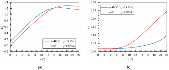 After verifying mesh-independence, the aerodynamic performance of the tail shape before and after optimization at different angles of attack was compared and analyzed. As shown in Figure 11a, after optimizing the shape of the tail wing, the lift coefficient increases in the range of 0°~14°, but decreases with an angle of attack of 14°. As shown in Figure 11b, the difference in the drag coefficient is not significant within the range of 0°~10°. At high angles of attack, the optimized tail drag coefficient decreases. In summary, due to the improved lift coefficient and reduced drag coefficient of the optimized tail, the gliding distance of the optimized tail is longer.
