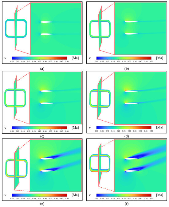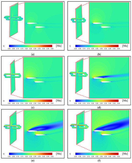 The velocity cloud map before tail optimization is shown in Figure 13. In the 0° angle of attack state (as shown in Figure 13a), the distance between the upper and lower wing surfaces of the tail is large, and the acceleration effect of the airflow in the duct is not significant. Compared with Figure 12a, there is no velocity difference between the upper and lower wing surfaces of the pre-optimized tail at a 0° angle of attack. Therefore, the lift coefficient of the optimized tail at a 0° angle of attack is greater than that of the pre-optimized tail. As shown in Figure 13b–d, as the angle of attack increases, the velocity difference between the upper and lower wing surfaces of the tail gradually increases, until the angle of attack reaches 12°. At the same time, stalling occurs on both the upper and lower wing surfaces of the tail. The lift coefficient of the pre-optimized tail in the angle of attack range of 0° to 12° is smaller than that of the optimized tail. As shown in Figure 13e,f, as the angle of attack continues to increase, the stalling area on the upper and lower wing surfaces of the tail increases, but it is not completely stalled. Compared with Figure 12e,f, the stalling area is smaller, resulting in a higher overall lift coefficient of the tail wing than the optimized lift coefficient in the angle of attack range of 16°~20°.