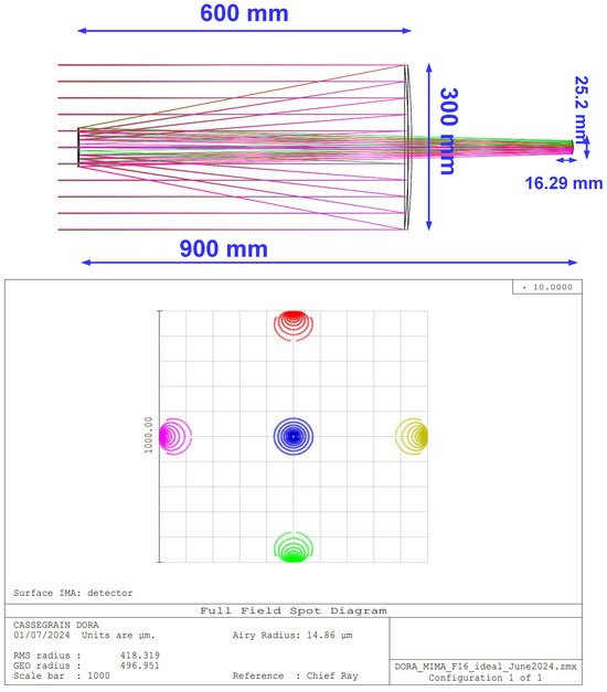 (Top panel): telescope optical layout including MIMA with the main dimensions: entrance pupil, mirrors separation, and back focal length. (Bottom panel): Spot diagrams relative to the ideal case for a wavelength of 10 m.