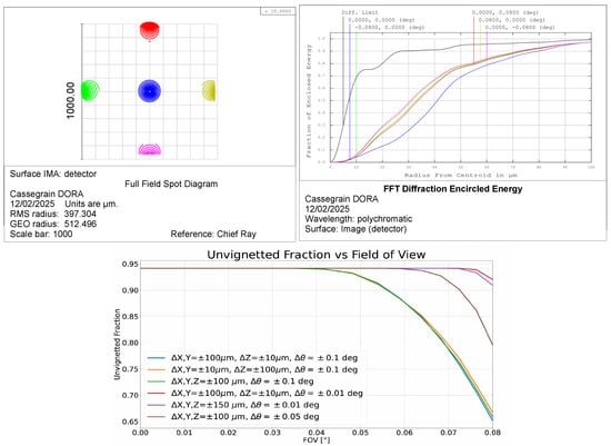 (Left panel): full field spot diagrams for the tolerance analysis worst case; the estimated Airy disk radius is 15.04 m for a 10 m wavelength. (Right panel): encircled energy fraction at different field angles compared to the diffraction limited mode. (Bottom panel): unvignetted fraction of rays over the entire FoV outcoming from 2500 Monte Carlo simulations for different combinations of linear and angular displacements.