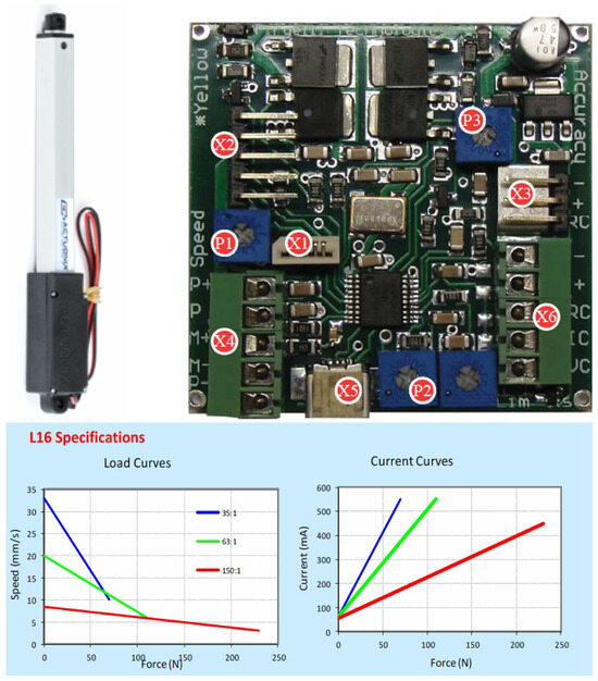 Top panel: Actuonix L16 model with relative stand-alone LAC board. Bottom panel: load capacity specs for different gear ratios. The red curve relative to a gear ratio of 150:1 corresponds to the selected actuator.