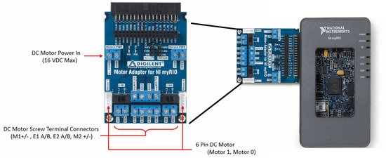 MyRIO board with Digilent motor adapter connected to it.