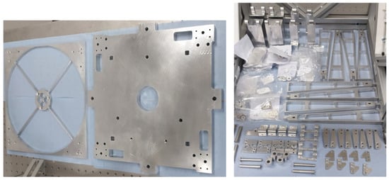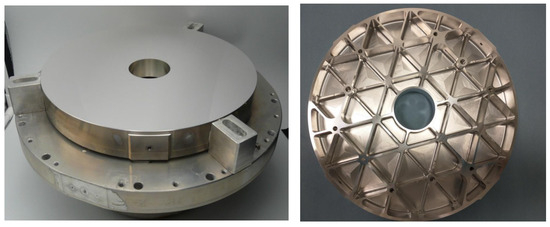 Both mirrors are made of aluminum 6061-T651 and diamond-turned. The diamond turning process has been followed by the figuring and polishing processes to achieve the required surface quality. A protected silver coating process was carried out at approximately 80 °C, during which internal stresses were released, resulting in a slight modification of the mirror’s surface shape, namely a variation of curvature radius, which measures = 1560.34 mm. Such coating warrants a reflectivity higher than 95% within the spectral range of 550–4000 nm and better than 92% up to 10 m. The primary mirror is lightweight, with a mass of 1.8 kg, milled from the blank to reach a thickness of 4 mm and generating ribs with an average thickness of 2.5 mm and fillet radii of 12 mm (Figure 7). The cells and ribs design task preserves an adequate stiffness against the vibration or deformation of the mirror’s optical surface. Its position in tip-tilt and despacing can be adjusted when the mirror is mounted on the S/C interface baseplate (Figure 3), acting on three M8 × 50 screws with coil springs together with three coupled tapered washers, distributed at 120° from the center and at a radial distance of 99 mm.