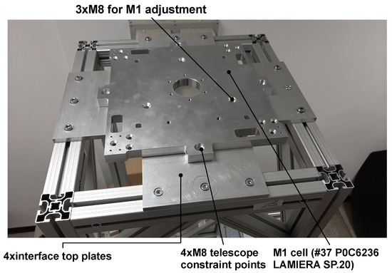 A finite element model analysis (FEA) has been performed for the final version of the telescope structure in the upside-down layout to check if such a configuration is compliant with the allowed displacements. To constrain the FEA model, four cylindrical contacts have been inserted in the M8 holes, and a remote force of 200 N has been applied at the center of mass, located in the proximity of the M2 vertex. The magnitude of the total deformations ranges from a minimum value of 3.40 up to 11.5 m. The estimated Von Mises stress distribution value is about 37 MPa, giving a margin of safety larger than 5. The overall layout of the supporting truss is depicted in Figure 6. The supporting truss is anchored onto an optical bench via eight angular blocks measuring 48 × 48 mm through M6 threads. The selected optical bench is a STANDA, type 1HT10-15-20, with 1.5 × 1 m dimensions, a 20 cm thickness, and a flatness error of 0.1 mm/m2.