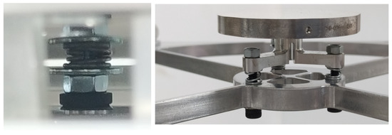 The first thing we did during the assembling procedure was place M1 on the optical bench and fasten it to the primary cell via three M5 × 50 mm screws, along which we inserted three coil springs together with three corresponding coupled tapered washers. As a second step, we bolted the primary cell plate, with an outer envelope of 320 × 320 × 20 mm (see Figure 8), with M1 preliminarily mounted, onto the supporting frame structure via four interfacing plates and M8 screws. We then fastened the M2 secondary mirror to the top ring via three M3 × 40 mm screws, along which we inserted three coil springs together with three corresponding coupled tapered washers (Figure 9).
