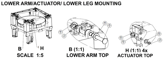 Next, we proceeded to mount the supporting blocks, which hold the lower arms and the actuators. Additionally, we installed bushings, where the pins are inserted, along with washers for each hinge. Figure 10 illustrates the details of the joints for the lower arm connections. For each pin and hole pair, a manufacturing tolerance of H7/h7 was assigned, which corresponds to a clearance value of 30 m. The actuators must be installed in their fully retracted configuration. Subsequently, the upper arms and hinges of the top ring were assembled in a manner similar to that used for the lower arms.