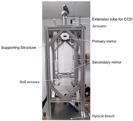 Deploying it vertically with the actuators pushing the secondary mirror downwards is the preferable option, since the actuators operate under the minimum effect of gravity. A modal analysis has also been conducted to check compliance with the frequency requirements: the first four eigenmodes are between 40 and 131 Hz. Therefore, we have decided to assemble the telescope in an upside-down fashion fixed to a supporting truss bolted onto the optical bench. Such an arrangement ensures that the additional focusing frame structure, bolted on the plate interfacing with the primary mirror cell, does not interfere with the ceiling. Moreover, it facilitates positioning the collimating laser system on the optical bench. The truss structure made of Al 6061, with outer dimensions of 510 × 510 × 1100 mm, consists of 12 square hollow tube bars of 50 × 50 mm, plus 16 oblique bars 30 × 50 with a stiffening function. Threaded inserts for M8 screws allow the connections among the bars.