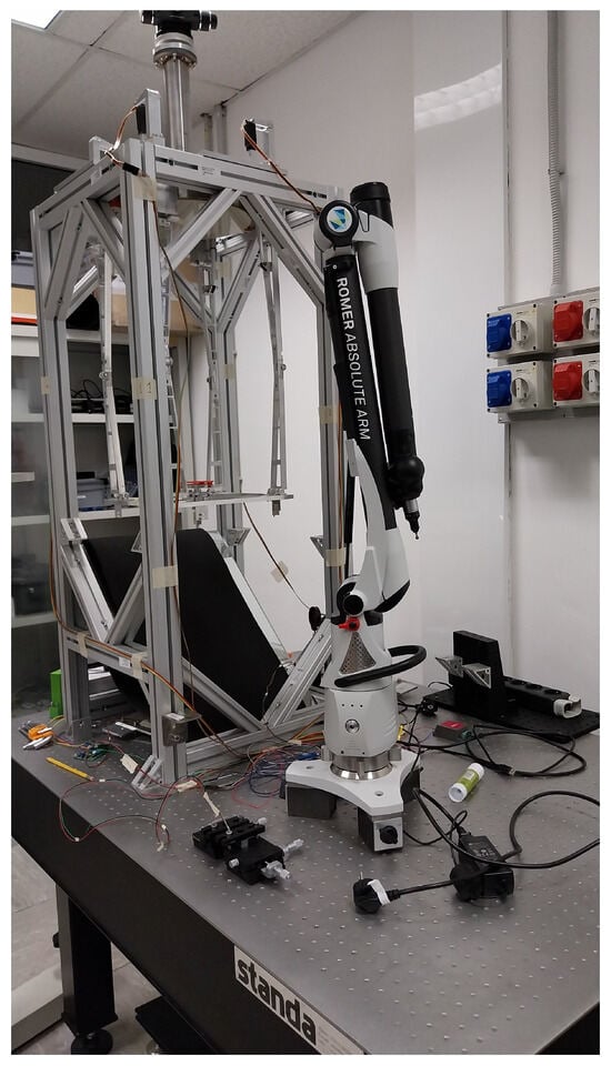 In order to measure the accuracy and repeatability of the telescope deployment, and to ensure that the retrieved values are compliant with the tolerance analysis assumed by the optical design, a Hexagon absolute Romer arm was used. This measuring device is a seven-axis articulated arm with interchangeable scanning probes (see Figure 13). For our specific application, we used a ∅ 6 mm spherical tactile probe of Rubidium, with an estimated intrinsic measuring precision of 30 m. Since our main objective is to analyze the statistics of the repeatability during deployment, it is more suitable to always refer to the same points on the structure. After fixing the Romer onto the optical bench, the absolute position in space of the arm tip was calibrated, defining a global reference system. At this stage, we are able, by defining a local coordinate system fixed to the telescope, to measure any absolute position in space and derive displacements of the same points from a previous measurement.