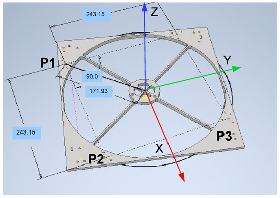 The allowed tolerances from the optical design are those derived from the sensitivity analysis of the optical design, respectively: x, y, z = ±100 m for decentering and despacing and , , = ±0.01° for tip-tilt, as described before. For convenience, we chose the three holes, each of ∅ 3 mm diameter for pin insertion, located on the top-ring and indicated by P1, P2, and P3 in Figure 14, as measurement points. In the local reference, the X-axis is oriented along P1–P2, the Y-axis along P2–P3, and the Z-axis vertically pointing upwards. The three points lie on a circle, with its center ideally lying on the optical axis, intersecting the vertex of the secondary mirror. We aim to analyze the statistics of the displacements of the circle center, the radius, and the top-ring rotation angles. Since we are assuming that the top ring plate behaves like a rigid body, we are interested in determining its displacements and rotations. Out of several deployment test sequences performed, after discarding the ones employed to set up the proper reference system, we identified nine deployment cycles. From Figure 14, we see that the holes are located at the vertices of a square with a side length of 243.15 mm, while the radius of the circle intersecting the three pins is equivalent to r = 171.935 mm.