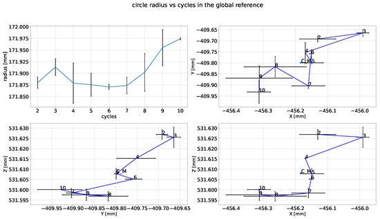 (Top left panel): mean values of the radii of the fitting circles for each of the nine (from 2 to 10) deploying cycles with their relative standard deviation. (Top right and bottom left-right panels): mean values of the offsets of the fitting circle center and their relative standard deviations, respectively, on X-Y, Y-Z, and X-Z planes. The average value of the calculated centers, named CM, is also indicated.