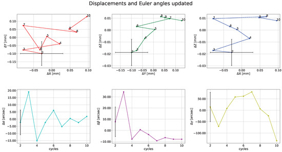 Plots of displacements and Euler angles of the local reference frame as pitch, roll, and yaw. The standard deviations are referred to the whole dataset from the second to the tenth cycle and are represented by a single value to avoid redundancy.