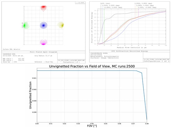 (Upper left panel): full field spot diagrams for the worst case of a Montecarlo tolerance analysis when applying the standard deviations of the displacements due to the deployment error. (Upper right panel): fraction of encircled energy at different field angles compared with the diffraction-limited value in black line. (Lower panel): fraction of unvignetted rays vs FoV for 2500 Monte Carlo runs, relative to the actual deployment errors.