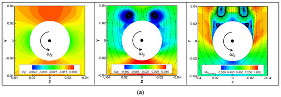 Figure 16 shows the pressure contours and crossflow streamlines at x/L = 0.7. Figure 16a presents the spinning motion case. At , the left-side surface spin rate decreases the crossflow velocity due to viscosity, and the surface pressure increases; the right-side surface spin rate compensates for the crossflow velocity, and the surface pressure decreases. Thus, a -z lateral force is induced with little flow separation. At , when the left-side crossflow cannot overcome the viscous drag force induced by the surface spin rate, the crossflow separation occurs with decreasing velocity and increasing pressure; the right-side surface spin rate compensates for the adverse pressure gradient, and the crossflow separation is delayed due to increasing velocity and decreasing pressure. An obvious negative lateral force is induced by the asymmetric flow separation and secondary vortices. At , the crossflow velocity increases and the expansion wave forms, which strengthens the contribution of asymmetric flow separation and weakens the contribution of asymmetric vortices to the -z lateral force.
