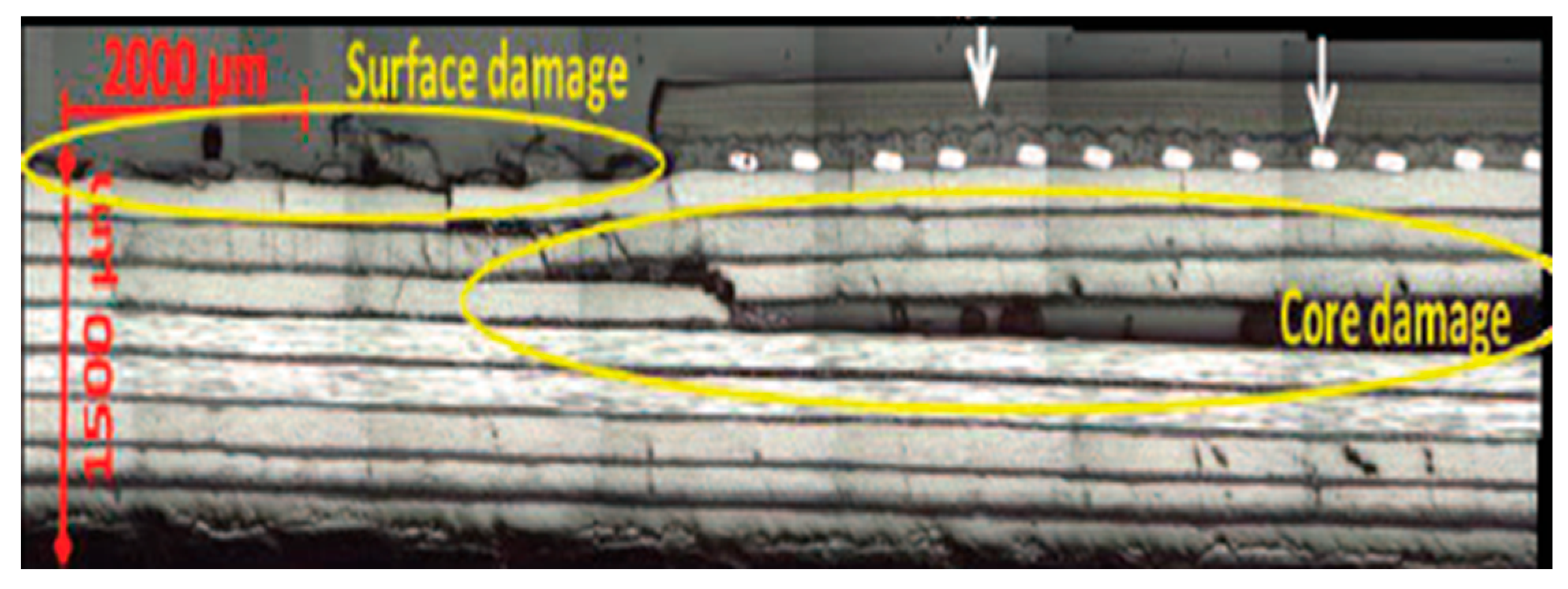 10], producing both low-depth thermal damage from the heating of the metal and core mechanical damage (