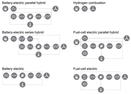 This section focuses on the design space, including changes in the electrical system as well as the inclusion of near-zero-emission fuels like hydrogen, detailing possible solutions that can pave the way to carbon-free aviation. The propulsion of an aircraft is functionally a set of systems and subsystems, which provide thrust for the aircraft as well as power to the rest of the aircraft systems. Traditionally in commercial aviation, this has been achieved through the use of combustion engines. To reduce aviation’s climate impact, new propulsion system concepts have been widely investigated throughout industry, research and academia. These trends include alternative fuels such as synthetic fuels or hydrogen as well as the electrification of propulsion systems. However, to this day, significant technology hurdles must be overcome to realize an entry into the market for these technologies. The electrification trend has broadly manifested itself in two ways: With the More Electric Aircraft (MEA), such as the Boeing 787 [25], each successive generation of aircraft employs more electrical equipment in place of systems that would previously have been mechanical, hydraulic or pneumatic, with specific design choices made for different vehicles. The second broad trend has been the increased focus on Electric Propulsion, fully or partially electric. Electrification and hydrogen are major focuses for this paper, together with the research on scalability potential across different aircraft classes. The following sections introduce different innovative propulsion system architectures as shown in Figure 2.