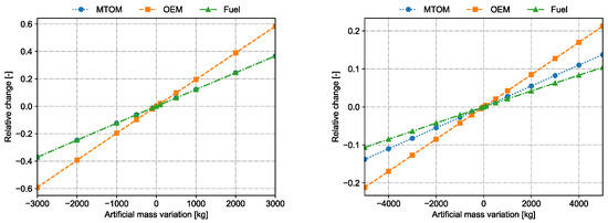 To account for impacts from the design of the systems (Collins Aerospace) on the overall aircraft design (PoliMi), including the resulting snowball effects, the Collins systems design was extended with the respective design sensitivities obtained with HYPERION. These sensitivities are represented by the Mass Growth Factor (MGF), which details the overall aircraft mass increase given a lumped variation of mass. To achieve this, several sensitivity studies were performed at PoliMi capturing “snowball” effects resulting from an imposed change in system weight for each aircraft configuration. Figure 4 shows the results of these studies for aircraft in Cat. 3 (left) and Cat. 4 (right), with a fuel-cell-electric (2030 scenario) and hydrogen combustion (BPR of 6) propulsive architecture, respectively. Similar trends are obtained for the other aircraft categories. In both cases, the parameter that is most affected by the artificial mass variation is the operating empty mass (OEM), with a more pronounced relative change for Cat. 3 aircraft. For regional aircraft, the hydrogen mass has the same relative change as that of the MTOM, as the aircraft performance is penalized by the significant increase in the OEM, whereas for the short-haul jet aircraft, the fuel has the lowest relative change due to its high specific energy. The MGF enables ASIM to consider repercussions of the system sizing on the MTOM, as the new design point is close to the original.
