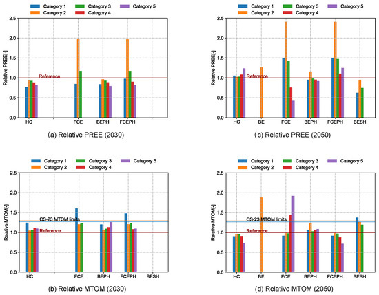The results of the scalability assessment for different propulsive architectures across the five aircraft categories are shown in Figure 6. To allow for a comparison of technologies that is unbiased by the intrinsic differences across the five aircraft categories in terms of PREE and MTOM, the shown parameters are normalized with respect to the value of the reference aircraft for each category. The reference values are indicated by the horizontal burgundy line. Furthermore, for aircraft in Cat. 1 and 2, certified according to CS23, the MTOM limits for certification (5670 kg and 8618 kg, respectively) are also shown. This plot offers a clear representation of the variation in PREE and MTOM, where an increase in PREE and a decrease in MTOM are considered to be advantageous. Finally, this plot details the propulsive configurations that do not converge to a feasible design, which are thus not represented in the plot. In general, the lack of convergence of certain architectures is linked to technologies not being mature enough to ensure a feasible design (BE and BESH for the 2030 scenarios, with an insufficient battery energy density) or to a mismatch between the architecture and the aircraft category (Cat. 4 and 5 are not possible with a BESH architecture).