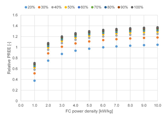 Fuel-cell-electric propulsion is considered a promising option for environmentally friendly aircraft operations, profiting from the high energy density of hydrogen and the absence of CO2 and other emissions. However, due to expected technology advancements in terms of the gravimetric index (GI) of tanks and in terms of fuel-cell power density, the obtained results suggest that FCE propulsion is only feasible for aircraft in Cat. 1, 2 and 3. Figure 7 shows the relative PREE compared to the reference aircraft for Cat. 3 for the FCE architecture as a function of fuel cell power density for different GIs. For the other system components, the 2030 technology scenario is assumed here.