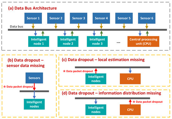 For the cases of sensor data packet dropout, the independent distribution variable is used to describe the data receiving state, where i indicates the sensor number. When the measurement signals are normally received, ; otherwise, . Therefore, the signals received by the intelligent nodes can be expressed by Equation (10).