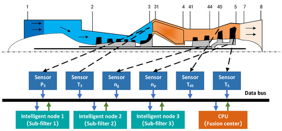 Currently, engine performance analysis methods can be primarily categorized into three types: model-based [3], data-driven [4], and knowledge-experience-based methods [5]. Among these, model-based performance analysis uses the engine model output as a benchmark to determine the difference between actual sensor outputs and the benchmark. By analyzing this difference, changes in component performance can be deduced. This method has been widely applied irrespective of data sample limitations. In numerous studies, the Kalman Filter is one of the more mature methods currently used. Traditionally, the implementation of the Kalman Filter is based on a centralized architecture, wherein a singular filter processes all sensor data. This approach is preeminent in structural simplicity and ease of implementation; however, it may lead to a significant computational burden on the central processor, complex communication lines, and limited sensor fault tolerance. With an advancement in distributed control technology, intelligent sensors, intelligent actuators, and high-speed bus technologies are gradually being applied to engines, providing favorable conditions for distributed filtering estimation structures for engine gas path performance. Distributed filtering methodologies leverage a network of sub-filters to independently process their respective measurement data in parallel, formulating a global algorithm to synthesize the local estimation outputs from these sub-filters into a comprehensive global result. Sub-filters are constructed independently, offering advantages such as high scalability, reduced computational burden on the central processor, and simplified communication lines. Therefore, this paper studies the distributed filtering method for a turboshaft engine.
