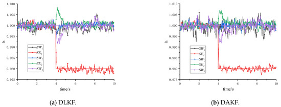 where M indicates the number of sun-filters and is the weight coefficient which satisfies the information conservation . Generally, is set as . When the intelligent simulation node where the sub-filter is located fails, the CPU will receive a fault indication signal. The fault sub-filter corresponding to will be set to zero, while the weight coefficients of the rest of the sub-filters are redistributed to meet the information conservation.