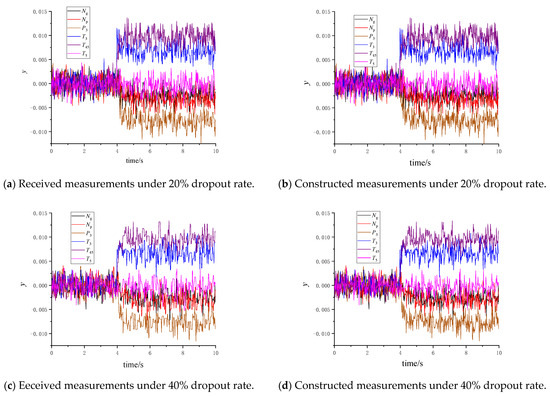 However, when different dropout rates are introduced, the DAKF method would combine the historical measurements with the engineβs mathematical model to reduce the influence of the dropout. Figure 10 presents the measured parameters received by the distributed control system and the constructed measurements under different dropout rates (20%, 40%, 60%, and 80%).