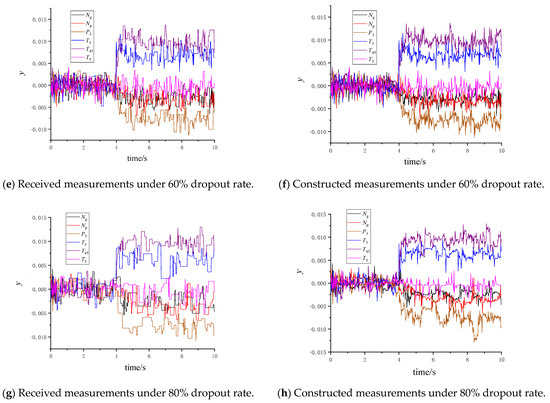 Figure 10a,c,e,g show the sensor data received by the distributed control system under different packet loss rates. It can be observed that some of the data points in the figures are not updated due to packet loss, resulting in shapes parallel to the x-axis. As the packet loss rate increases, this phenomenon becomes more pronounced. Figure 10b,d,f,h present the composite measurement data, which are composed of the received measurement data and the reconstructed measurement data for the lost packets. These variations in signal quality effectively demonstrate how our method performs across different network reliability scenarios, highlighting its robustness in handling packet dropout during data transmission.