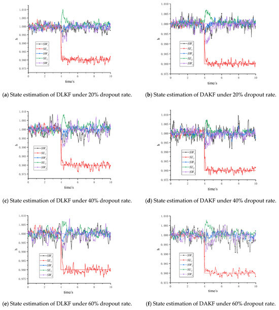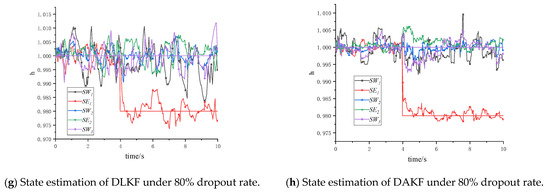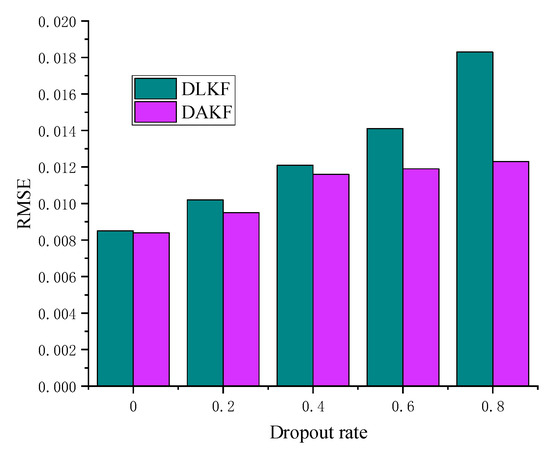From Figure 11 and Figure 12, it can be seen that when the dropout rate is low, both DLKF and DAKF can provide good estimation results. However, as the dropout rate increases, the DLKF method gradually exhibits a trend to converge, whereas the DAKF method shows better robustness. However, once the dropout rate reaches a threshold, the decline in accuracy for the DAKF method slows down significantly. The higher the dropout rate, the more pronounced the accuracy advantage of the DAKF method becomes.