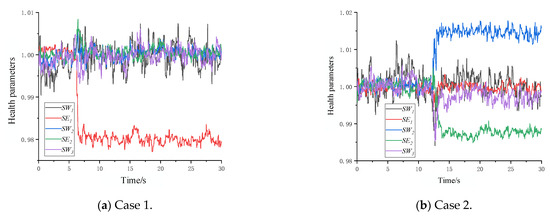 To validate the estimation performance of the proposed DAKF, further simulation verification is conducted under the network uncertainty within the distributed control architecture. The simulation is carried out at the operating point H = 0 m, Ma = 0, with a bus dropout rate of 30%. The fault modes correspond to failure mode 6 (case 1) and failure mode 4 (case 2) listed in Table 9. Since the distributed control architecture does not provide functionality for simulating network failure environments, the data dropout is modeled as a random process which follows a Bernoulli distribution. The performance monitoring results under network uncertainty in the distributed control architecture are shown in Figure 14.