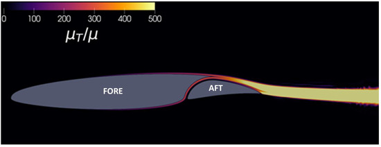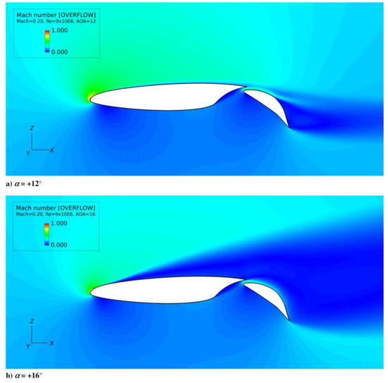 To overcome the SNLF airfoil’s abrupt stall characteristics, a computational analysis was performed to investigate the potential of the aft element to act as a high-lift device [45]. Four configurations were investigated: a baseline S204 aft element, a deflected aft element or Fowler flap, a deflected micro-flap, and both a combination of Fowler flap and micro-flap. Computational simulation was performed with the structured, overset grid solver NASA OVERFLOW V.2.2n, a RANS-based approach, to determine the integrated lift forces. Figure 13a shows off-the-surface separation, where the off-surface wake from the fore element suddenly appears to thicken above the wake of the aft element. In Figure 13b, with the α increased to 16°, the flow is shown to be fully separated. Thus, at higher α values, additional work is needed to improve the subsequent drop in the maximum Cl. It was concluded that a constant slot width is optimal for maximum efficiency of microflap deflections. Additionally, deflecting the microflap downwards rather than upwards provides increased microflap lift. A Fowler flap resulted in a higher maximum lift at a lower α, and a simple flap also provided an improved Cl with potentially less abrupt stall characteristics. Thus, high-lift devices have the potential to increase the fuel efficiency of the SNLF airfoil.