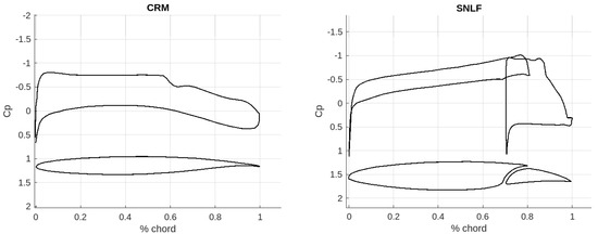 Figure 4 compares the single-element NASA CRM.65 airfoil with the two-element S207 SNLF airfoil at cruise conditions. The S207 airfoil’s aft element produces a considerable amount of lift during cruise while the trailing edge of the single-element airfoil displays little to no lift. The result of employing a two-element airfoil is that the aft element produces higher lift as it recovers the free-stream pressure.