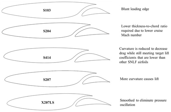 SNLF airfoil shapes (cross-sections reproduced from [15,16,24,25,31,32]).