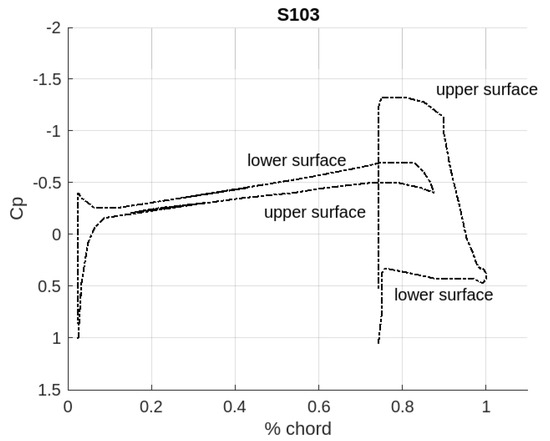 Pressure distribution over the S103 airfoil at the design point (cruise). (Graph reproduced from [24]).