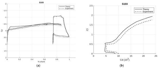 Comparison of theoretical and experimental results for the S103 airfoil at Re = 3 × 106, M = 0.10 in the transition-free state. (a) Pressure distributions along the cross-section for α = −1.07°. (b) Cl vs. Cd (Graph reproduced from [24]).