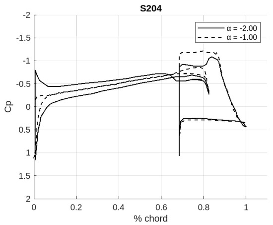 Theoretical S204 pressure distribution at M = 0.65, Re = 12 × 106, and α = −1° and −2° (cruise). Graph reproduced from [16].