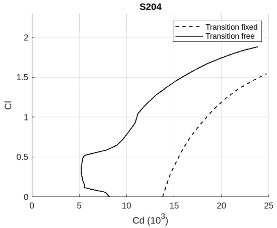 Theoretical S204 transition locations and section characteristics at M = 0.1 and Re = 3 × 106 (transition-free state). (Graph reproduced from [16]).
