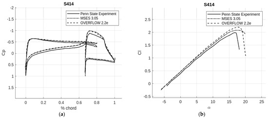 In 2009, the S414 was experimentally tested through a series of wind tunnel tests in the Pennsylvania State University Low-Speed, Low-Turbulence Wind Tunnel (LSLTT) [25]. Additional computational fluid dynamics (CFD) analysis was performed using NASA’s OVERFLOW CFD solver [40] and the results were compared with the experimental data and MSES predictions. Figure 11 provides a comparison of performance predictions generated with MSES and OVERFLOW to the wind tunnel results at Re = 1.5 × 106. MSES and OVERFLOW results are in general agreement, with the largest discrepancy observed on the Cl vs. Cd plot (Figure 11b). MSES is a flow solver that predicts the aerodynamic behavior of airfoils based on the Euler equations. OVERFLOW is a 3D Reynolds-averaged Navier–Stokes (RANS) solver that employs structured overset grids to predict fluid flow. While MSES and OVERFLOW are both uniquely able to analyze multi-element airfoils, MSES performed notably better than OVERFLOW, specifically for the drag polar predictions. OVERFLOW does not model laminar-turbulent transition and thus cannot capture the sharp corners on the drag polar, so it cannot provide well-defined drag limits or detect rapid changes in drag. Similarly, OVERFLOW significantly over-predicts the low-drag range coefficients [37]. Thus, the overall versatility of MSES proved better than OVERFLOW for the theoretical aerodynamic analysis of the S414 airfoil.