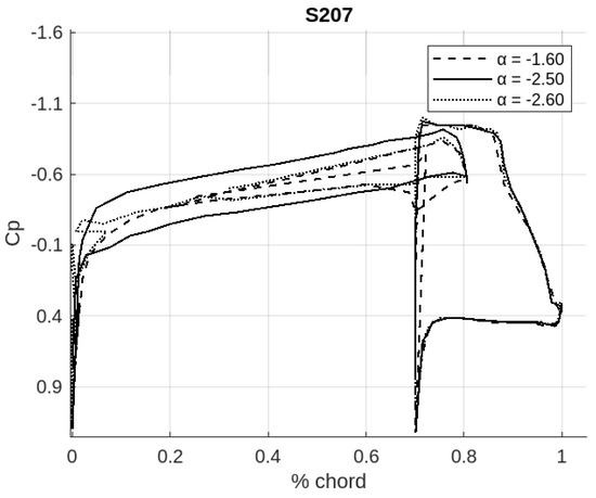 S207 airfoil pressure distributions at M = 0.70 and Re = 13.2 × 106 for α = −1.6°, −0.7°, and −0.6°. (Graph reproduced from [30]).