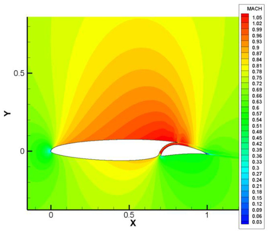 Mach number contours with the Fowler flap deflected + 40° and microflap deflected + 10°. Reprinted with permission from Ref. [46], 2022, Hector D. Ortiz-Melendez and James G. Coder.