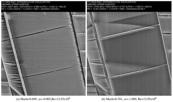Figure 16 shows the infrared (IR) thermography results visualizing the flow on the upper surface of the wing, Figure 16a captures the flow for M = 0.699, Re = 12.93 × 106, and α = −0.002, and Figure 16b illustrates the flow for M = 0.701, Re = 12.95 × 106, and α = −1.000 [48]. From the images, it is clear that distinct lines are visible in Figure 16b that are not seen in Figure 16a, indicating that the configuration and flow conditions of the wing in Figure 16a are conducive to the production of large regions of laminar flow on the upper surface, as designed. By observing the lift and drag force data collected from the experiment, there is both the expected trend of increased lift with increased M and the unexpected trend of increased drag coefficient with increased M. The study hypothesizes the cause for the latter observation could be that the fairing caused shockwaves at lower M. Overall, the experimental results confirmed the predicted performance: (1) there is a reduced amount of drag accompanying the laminar flow, (2) aft element deflections led to higher lift as demonstrated in the high-lift configuration, and (3) that abrupt stall occurs, although the stall is lessened at increased M.
