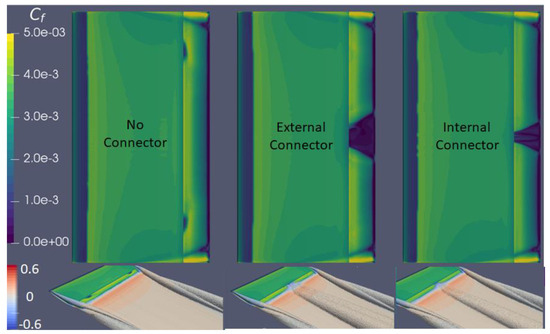 Top, separation of flow; bottom, Eddy viscosity ratio displaying the difference between sections with no connector, an external connector, and an internal connector. (Image provided courtesy of Dr. Doug Stefanski).
