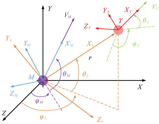 where and represent the components of the missile’s acceleration vector in the inertial coordinate system, while and denote the components of the target’s acceleration vector in the same system. The corresponding relative kinematic equations in the LOS reference frame can be expressed as follows:
