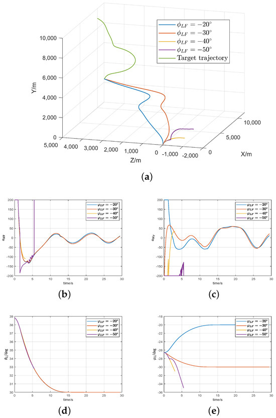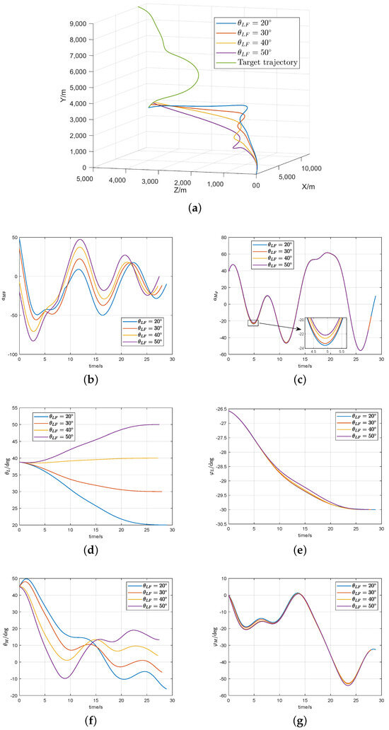 First, we conducted simulations of our proposed guidance law against a target performing sinusoidal maneuvers, considering different terminal angle constraints. The target acceleration rates were set as and . The desired LOS angles are the following conditions: