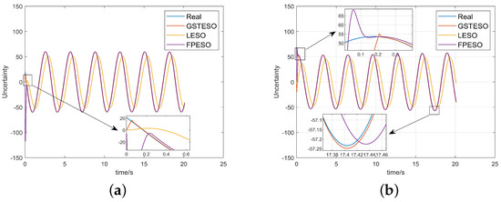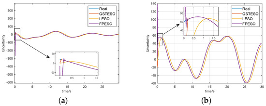 Figure 6 shows the comparison of the three kinds of observers, in which the Fractional Power Extended State Observer (FPESO) is an observer mentioned in references [32,33,34], and its expression is defined as follows: