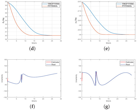From Figure 9b,c, it is evident that when faced with simple constant maneuvers, the FNTSMGL still reached overload saturation in the initial phase, whereas our guidance law remained smooth. Figure 9f,g show that the GSTESO could still quickly approach the true values, which is a satisfactory performance.